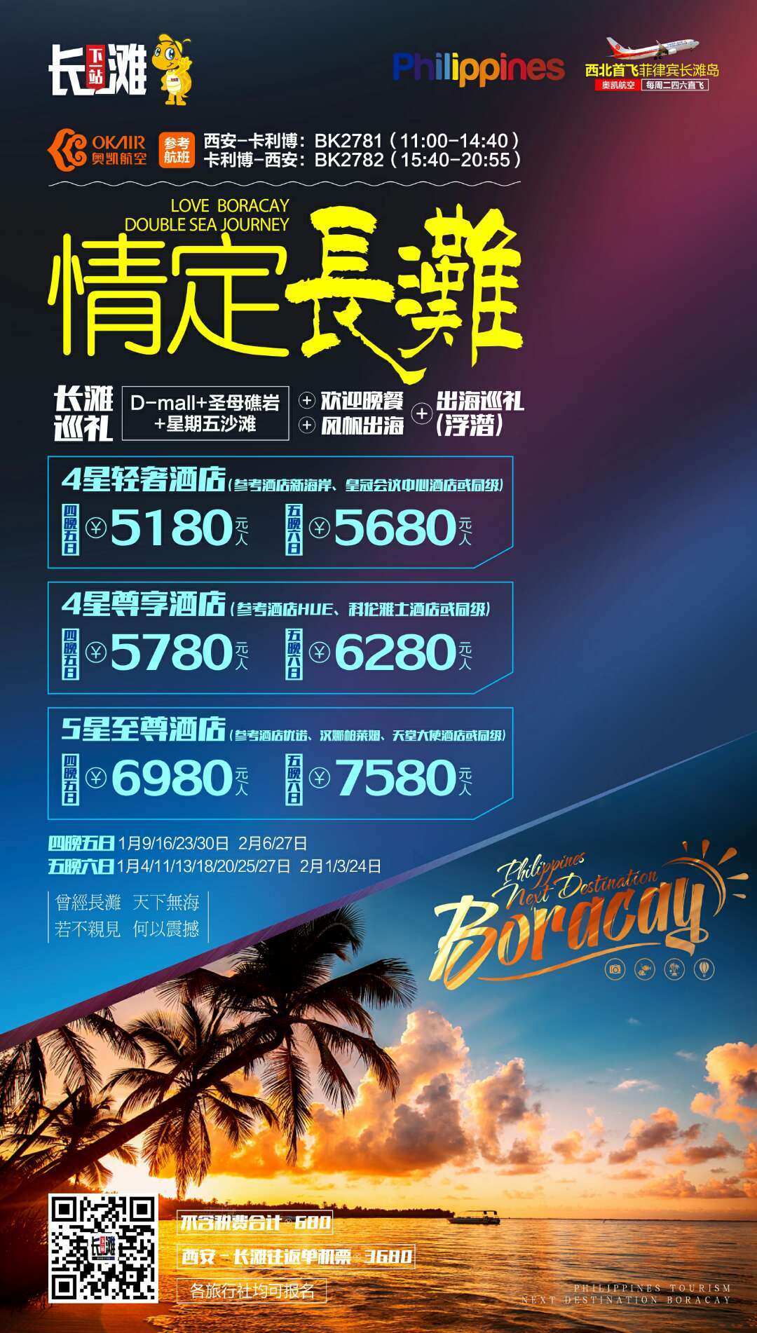 初見長灘/西安-長灘卡利博參考航班: BK278111:00---14:40 島覽長灘/歡迎晚餐+徒步島覽(D-MALL、圣母礁巖、星期五沙灘) 于指定時間地點(diǎn)西安咸陽機(jī)場集合,乘機(jī)飛往多次被評為世界最美海灘第一名的菲律賓長灘島。抵達(dá)后導(dǎo)游接機(jī),乘專車約1.5小時前往碼頭,乘船約十分鐘登島,抵達(dá)酒店休息片刻,導(dǎo)游熱情帶領(lǐng)大家徒步探索長灘島核心地帶。首先來到二號碼頭,這里是整個長灘島最熱鬧的地方,最有名的就是購物街D-MALL,那里匯聚著各種餐廳、酒吧、紀(jì)念品店、娛樂場所。隨后順著第一沙灘往北徒步約20分鐘,便來到長灘島的地標(biāo)【圣母巖礁】,該礁巖造型奇特,自然天成,落潮時以沙灘相連,可以徒步登臨,漲潮時又獨(dú)立成島,蔚然成景,是拍照留念的好地方。【星期五海灘】沙細(xì)如粉,碧海玲瓏,是游客賞海娛樂的絕佳之地。這里也是沙雕愛好者的天堂,您不難找到各種高超的沙雕作品,也可以加入其中,發(fā)揮您藝術(shù)的想象力親手創(chuàng)作。島覽結(jié)束享用特意為您安排的長灘歡迎晚餐。