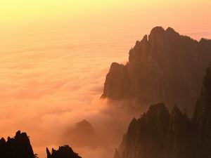 云海玉盤----泰山云霧可謂呼風(fēng)喚雨,變換無窮:時(shí)而山風(fēng)呼嘯,云霧彌漫,如墜混沌世界;俄頃黑云壓城,地底興雷,讓人魂魄震動(dòng),游人遇此,無須失望,因?yàn)槟銓⒁姷皆坪S癖P的奇景:有時(shí)白云滾滾,如浪似雪;有時(shí)烏云翻騰,形同翻江倒海;有時(shí)白云一片,宛如千里棉絮;有時(shí)云朵填谷壑,又象連綿無垠的汪洋大海,而那座座峰巒恰似海中仙島。站在岱頂,俯瞰下界,可見片片白云與滾滾烏云而融為一體,匯成滔滔奔流的“大!,妙趣橫生,又令人心朝起伏。