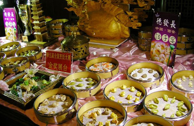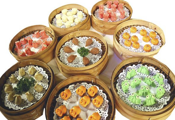 所謂餃子宴,就是用不同顏色不同成分的餃子皮,包裹不同的餡肉,捏成不同外型的餃子,蒸煮好輪番上桌,整餐飯純