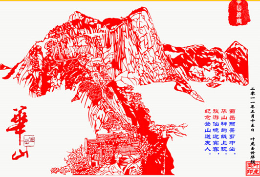華山剪紙:剪紙是勞動人民在生活中寄托情感,抒發(fā)胸臆的一種藝術(shù)形式,多見于窗欞、門簾、頂棚、炕圍等民間住宅,也用于陶瓷、刺繡、印染等藝術(shù)品,風(fēng)格明快簡潔、手法夸張樸拙。華山剪紙因地域的不同而風(fēng)格各異,有的秀麗明凈,有的概括凝煉,有的柔健相濟(jì),有的粗獷古拙,表現(xiàn)出了豐富的藝術(shù)形象。